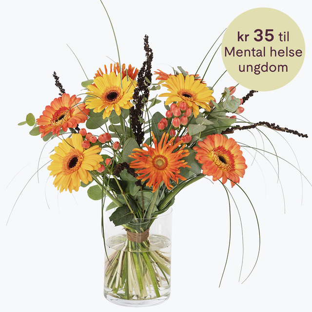 En varm og fargerik hilsen som lyser opp dagen, der 35 kr av inntektene per solgte bukett, går til Mental Helse ungdom. Når du velger denne gerbera-buketten gir du ikke bare en hilsen til en du bryr deg om, du blir også med på å støtte Mental Helse Ungdom i deres arbeid for å fremme psykisk helse blant unge. Det er en gave som sprer glede til mottakeren - og mange flere.
